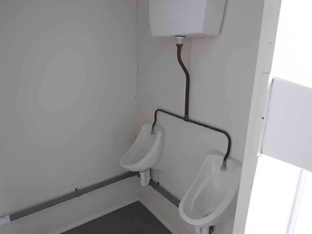 The 2+1 configuration offers two male toilets, two urinals, two sinks with water heater on the male side, and a separate female toilet with its own sink and water heater all equipped with electric lighting, heating, and extractor fans for comfort and ventilation. The unit stands securely on corner posts with no jacklegs required and features robust steel construction to deter vandalism and theft.