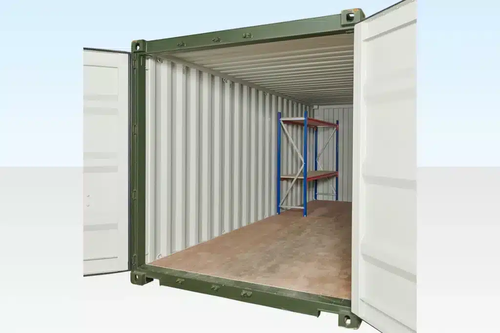 It is possible to use racking on both sides of a 10ft container. However there is not enough room to fit racking on the end wall.