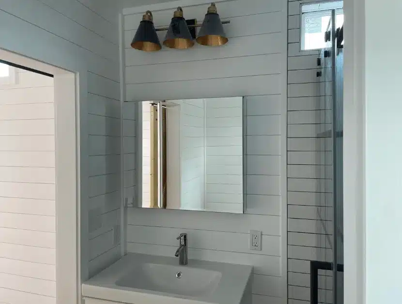 | Framing & Walls | 2×4 wood studs at 16″ centers with white shiplap interiors |